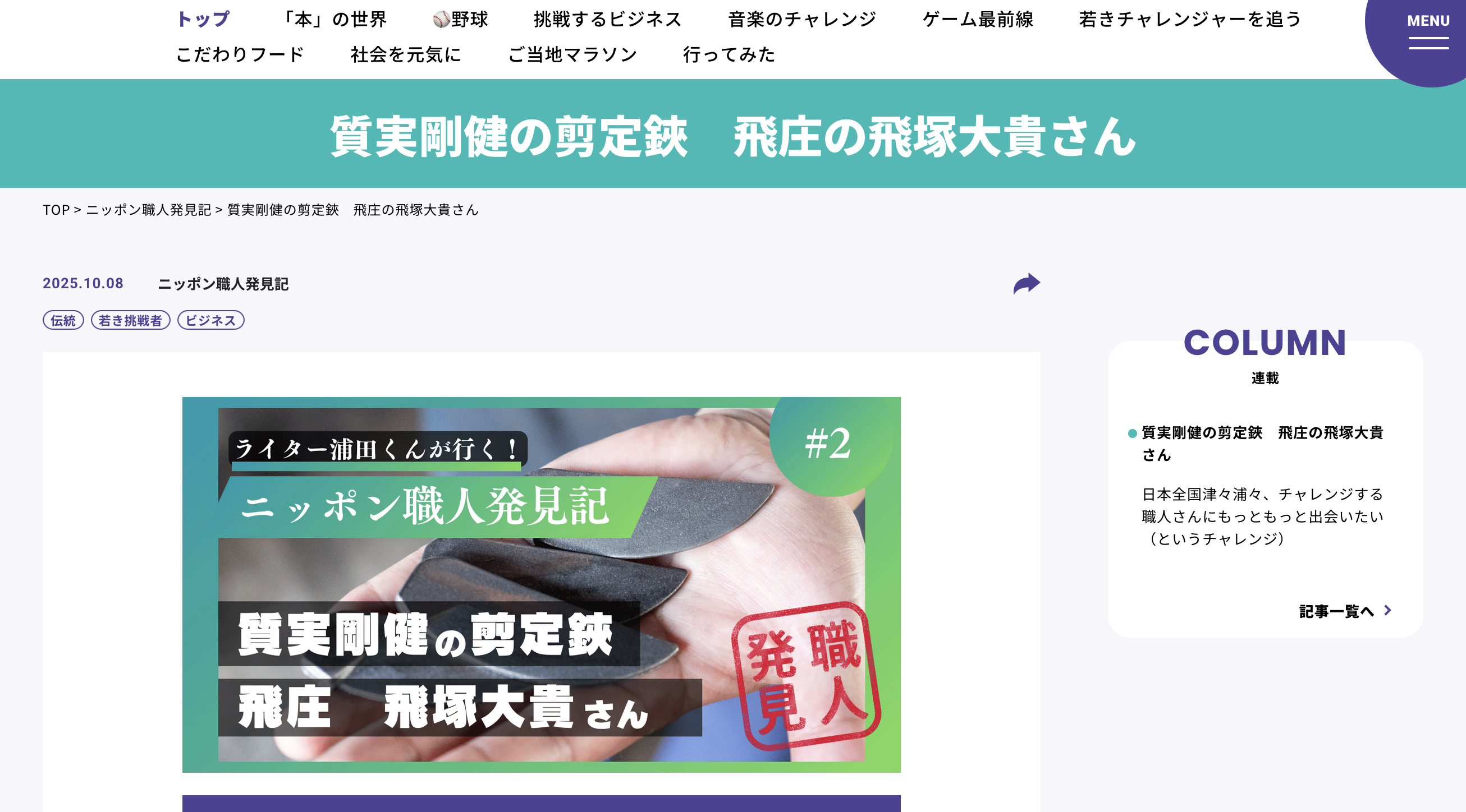 - わかさ生活の「挑戦する人を応援する」オウンドメディアサイト、『DEKIRU!』の「ライター浦田くんが行く!ニッポン職人発見記」において、剪定鋏鍛治の飛庄さんを取材。4代目の飛塚大貴さんの挑戦についてインタビューさせていただいた。
