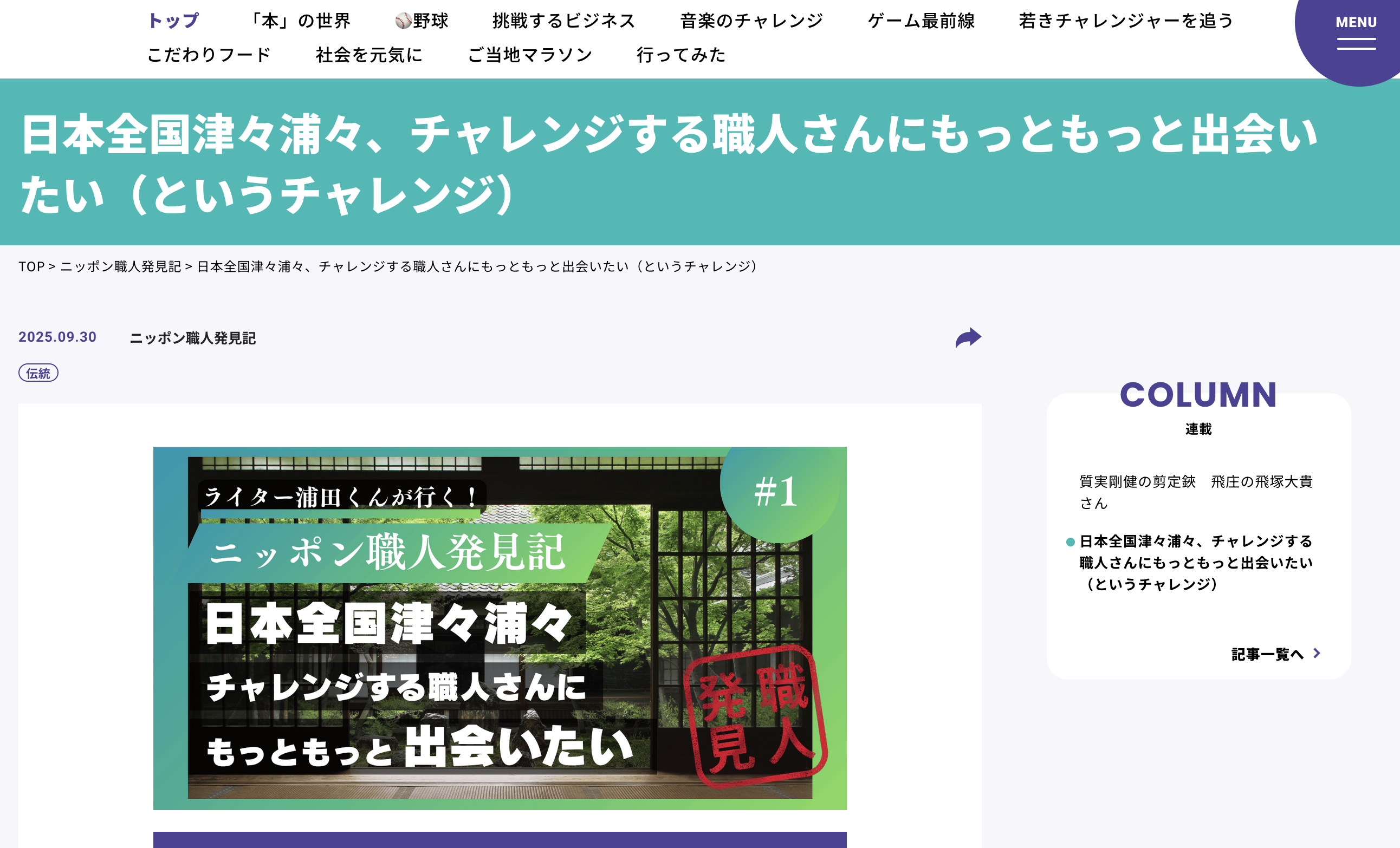 - わかさ生活の「挑戦する人を応援する」オウンドメディアサイト、『DEKIRU!』の「ライター浦田くんが行く!ニッポン職人発見記」がスタート。連載開始にあたり、どのような課題をどう解決していくのかを所信表明した。